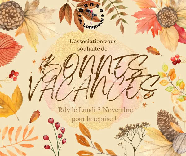 Chers adhérents, chères adhérentes, Il est l’heure pour nous de vous souhaiter de bonnes vacances d’Automne. Profitez bien de ces deux semaines pour vous reposer (et n’oubliez pas de réviser un peu quand même, nous avons un spectacle de Noël à préparer…) Nous vous donnons rendez-vous dès le Lundi 3 Novembre pour la reprise des …