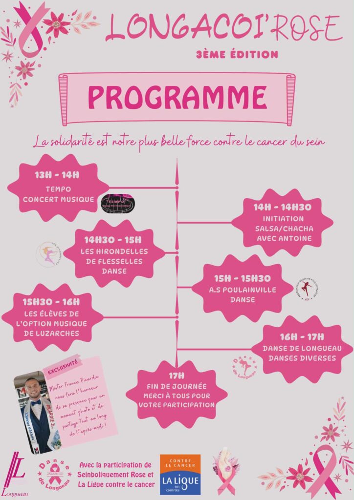 Chers adhérents, chères adhérentes, Découvrez dès à présent, le programme des animations attendues lors de notre Longacoi’rose, Samedi 25 Octobre à la salle Paul Hédé de Longueau. Nous remercions d’avance tous les artistes qui participeront bénévolement à cet évènement qui a pour but de récolter un maximum de fonds pour la recherche contre le cancer …